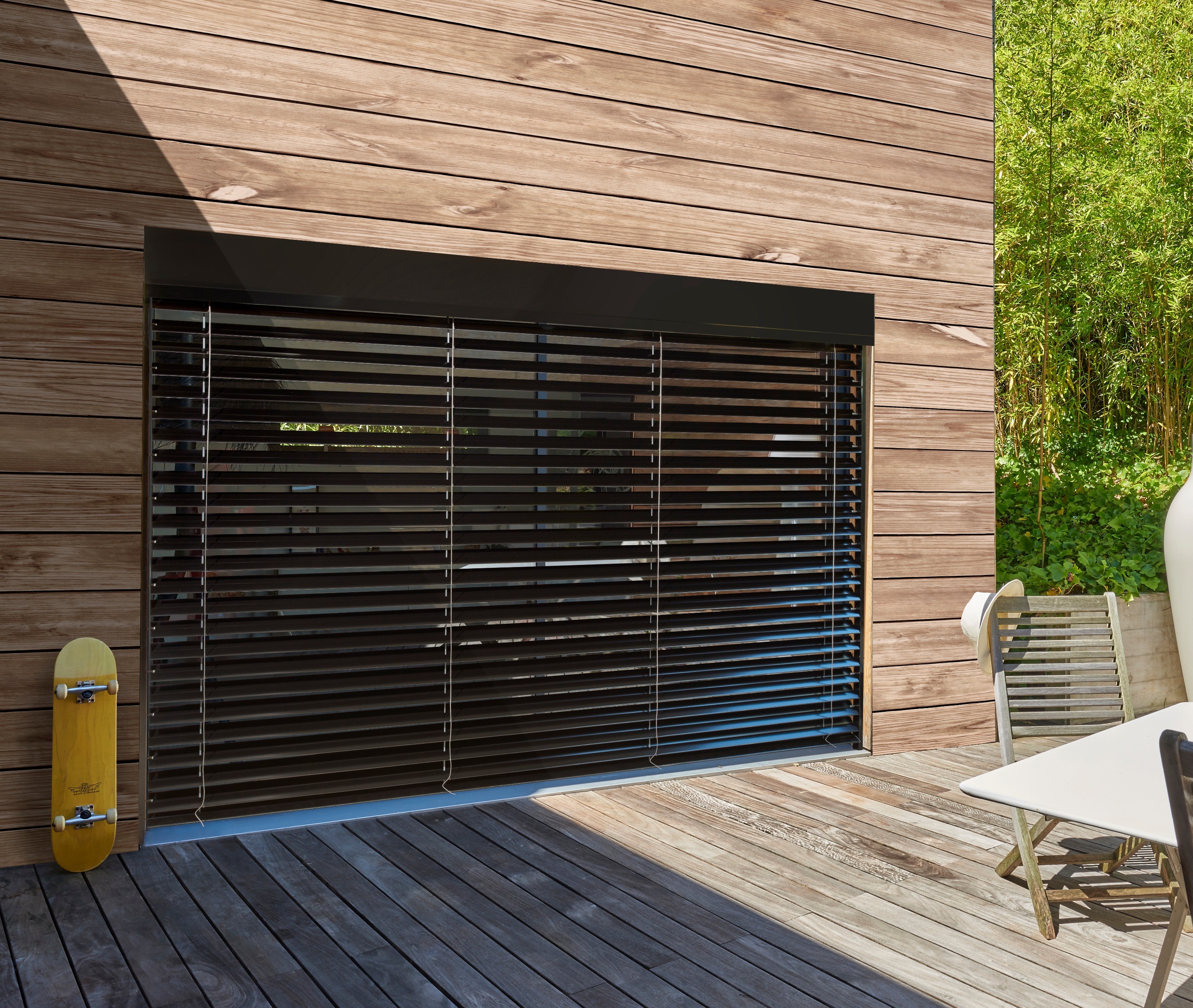Lignes tendues, tout aluminium, il équipe à merveille les architectures modernes. D’un clic sur la télécommande, vous descendez ou pivotez les lamelles. Vous conservez de la lumière quand le store descend, les lames restant inclinées. Réglage de l'inclinaison des lames en position basse.