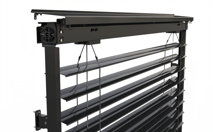 La pose est identique à celle d’un volet roulant. Livré monté monobloc, le mécanisme s’emboîte dans les coulisses autoportantes.
