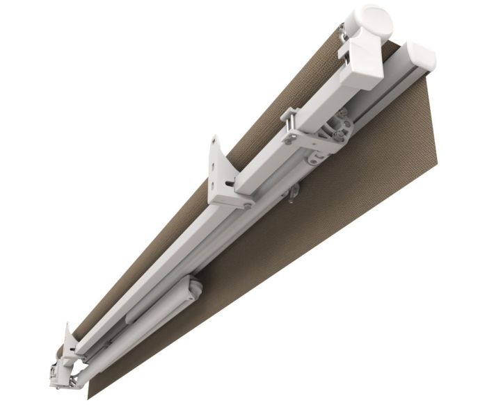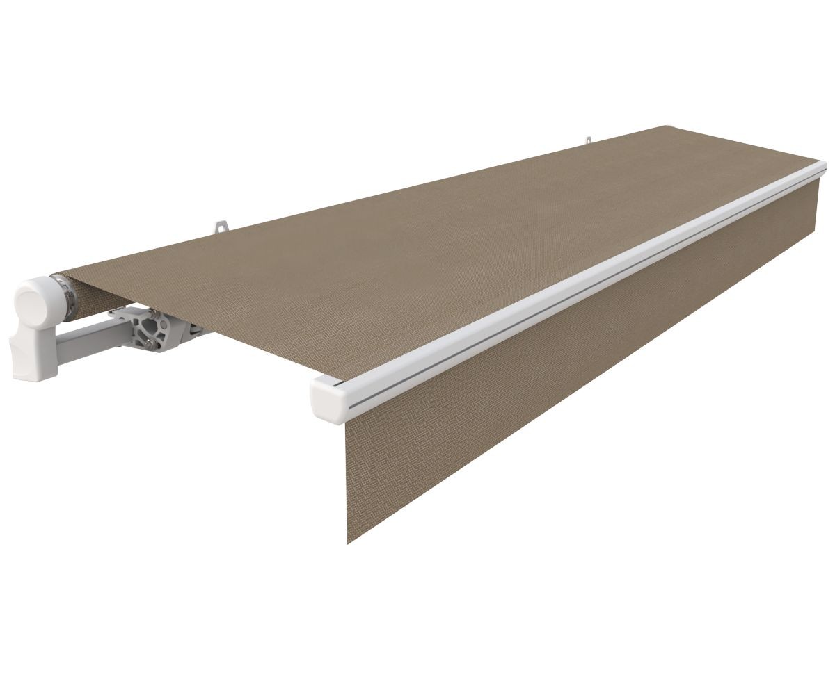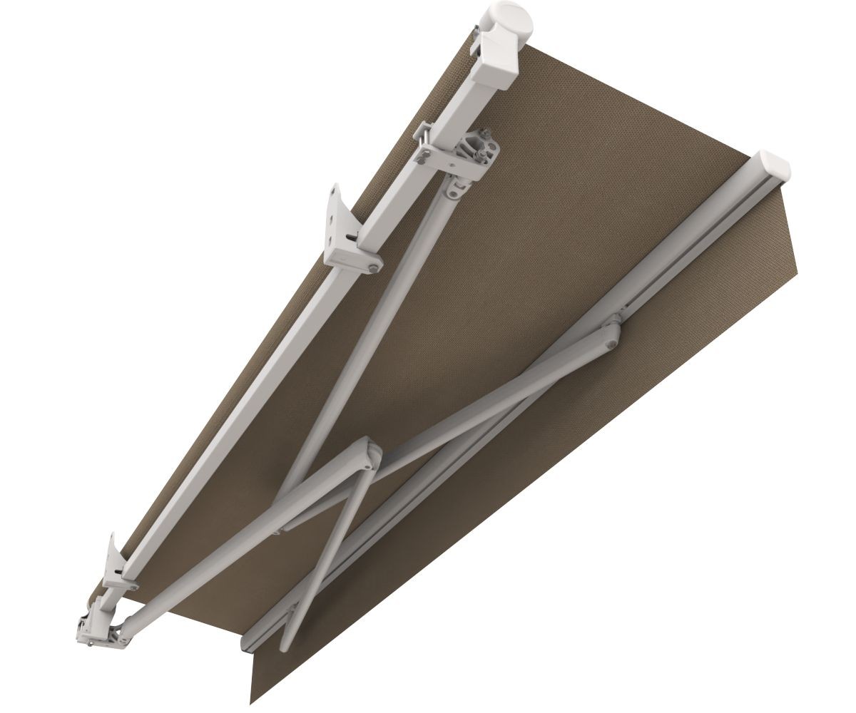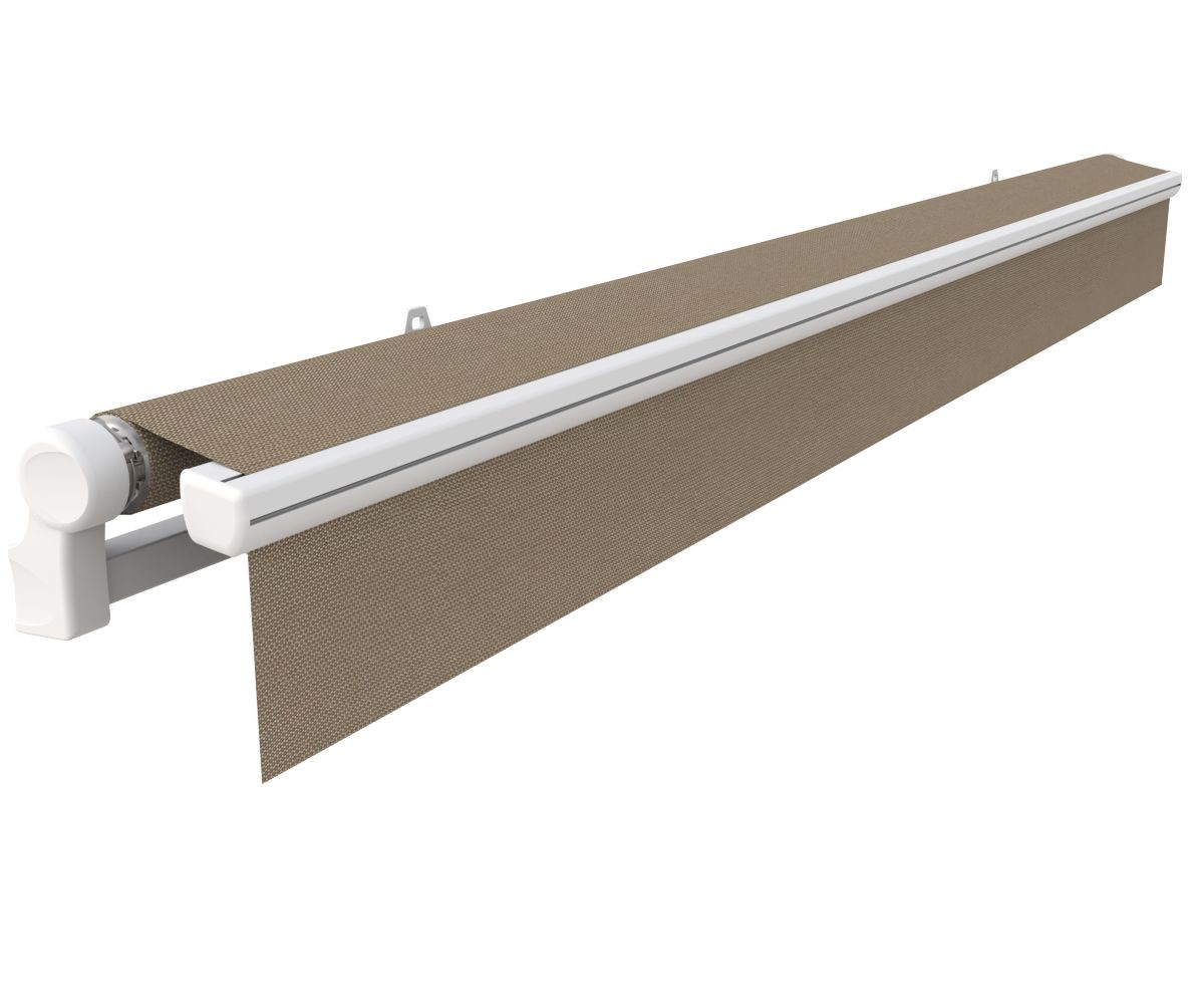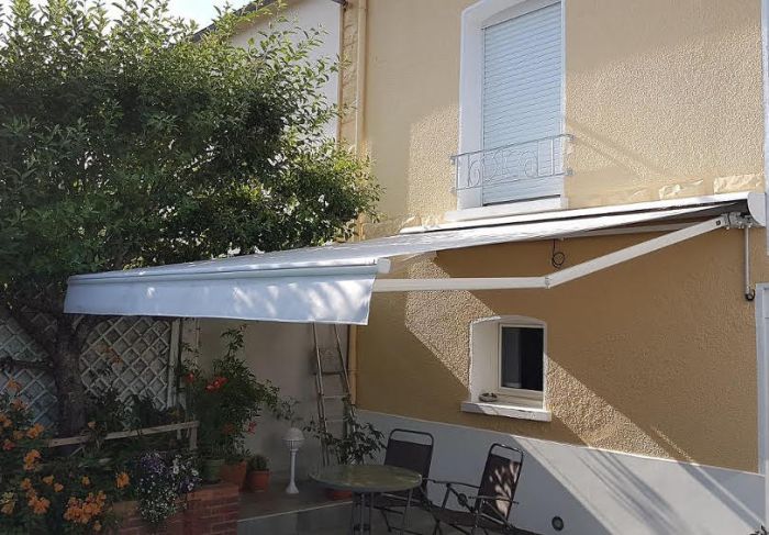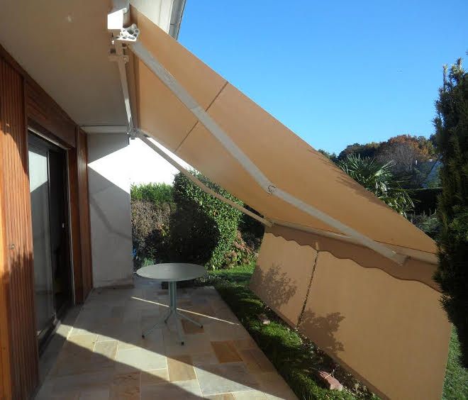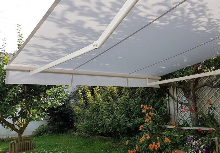 Télécommande radio, Commande secours, capteur-vent, lambrequin enroulable manuel, auvent aluminium, éclairage Leds, impression sur lambrequin, lambrequin lumineux