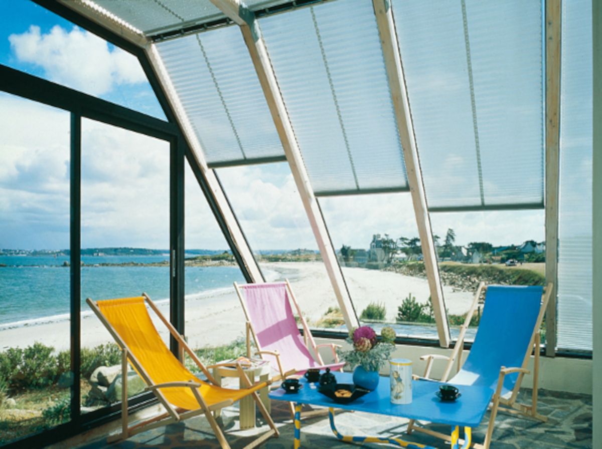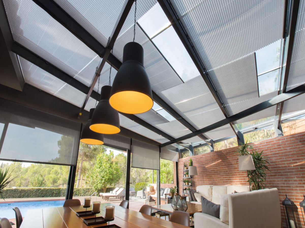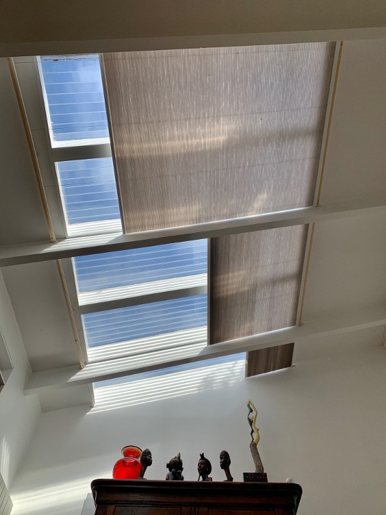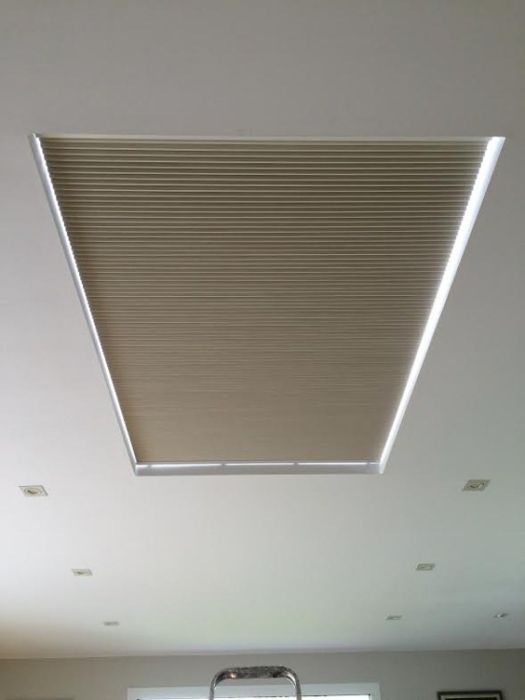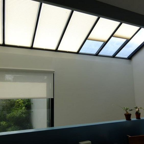 Parfait pour filtrer la lumière venant du toit, le store plissé vélum s'intègre discrètement aux toitures de verre et vérandas. A l'aide d'une perche téléscopique, vous ouvrez et fermez le store. Large choix de tissus tamisants ou transparents. Possibilité de cornière aluminium d'occultation sur demande (option). Marque Bandalux.
