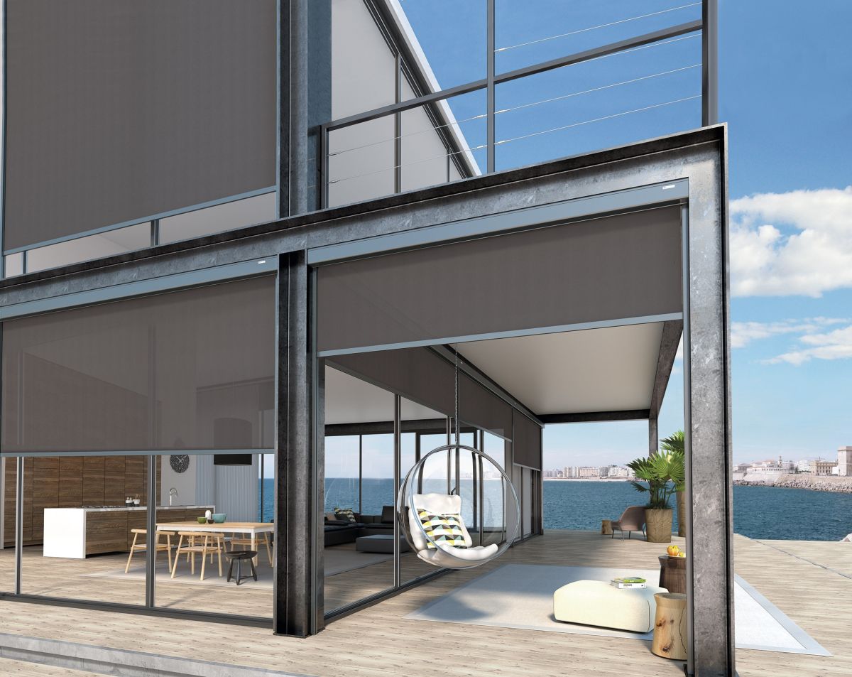 Ce store vertical screen extérieur est recommandé pour les grandes ouvertures. Equipé d'un coffre de protection, il couvre les baies jusqu’à 4m80 de largeur et 7m de haut. Très robuste, facile à poser, il est le store d'occultation idéal pour tamiser les grandes fenêtres. Atout choc, ses formes carrées et tendues se marient bien aux architectures modernes. La toile est tenue et guidée par des coulisses en alu ou des câbles en inox.